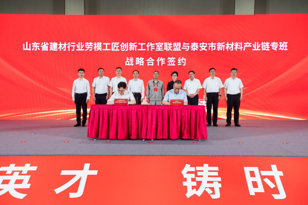 活動現(xiàn)場宣讀了《山東省建材行業(yè)勞模工匠創(chuàng)新工作室聯(lián)盟理事長單位、特邀理事單位、理事單位及成員單位名單》《山東省建材行業(yè)勞模工匠創(chuàng)新工作室聯(lián)盟理事長、特邀理事、理事、成員及秘書處人員名單》,郭明義為全國人大代表、全國勞動模范、泰安市總工會兼職副主席、泰山玻纖設備管理部部長溫廣勇頒發(fā)聯(lián)盟理事長單位聘書,與會其他領導為特邀理事單位、理事單位頒發(fā)了聘書,舉行了聯(lián)盟成員代表宣誓活動,泰山玻纖黨委副書記、總經理劉利鋒發(fā)言。省建材行業(yè)勞模工匠創(chuàng)新工作室聯(lián)盟與泰安市新材料產業(yè)鏈專班,圍繞信息共享、項目合作、人才培育、活動開展四個方面,特別是培育打造具有全國影響力的建材領域大國工匠簽署戰(zhàn)略合作協(xié)議。